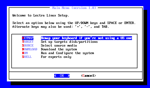 The Lectra distribution uses the same principles as other distributions--two boot floppies and a CD-ROM. The installation screens use dialog-0.3, which has proved to be extremely simple and powerful when it comes to creating a series of installation screens. The main Lectra Linux installation window can be seen in Figure 1.