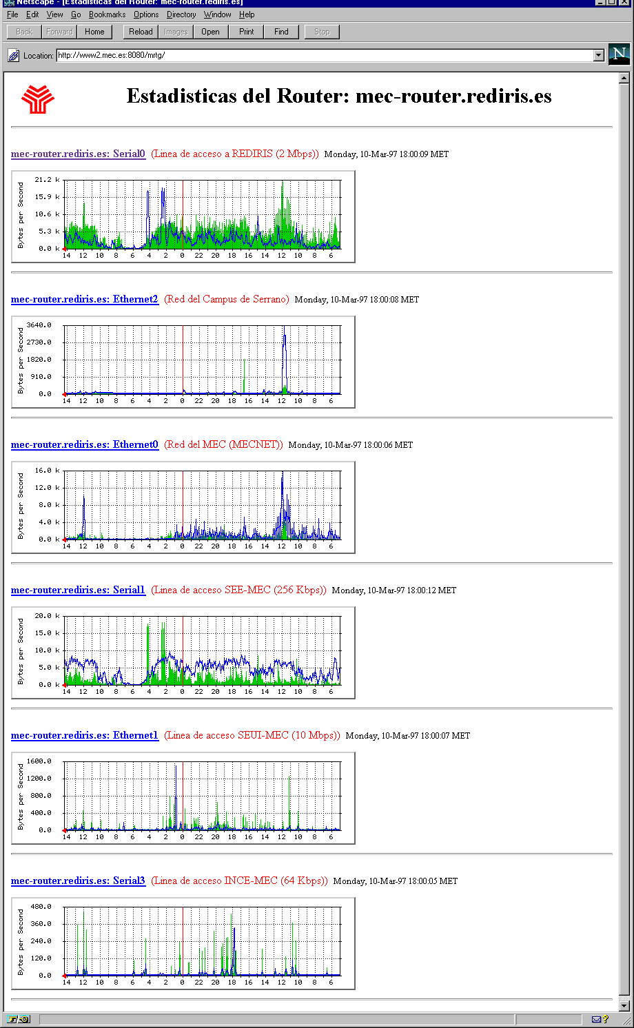 indexmaker mrtg.cfg <router-name regexp> > /usr/local/web/mrtg/index.htmlIt will generate an HTML page with the daily graphs of interfaces whose router name matches the previous regular expression and links to their single detail pages.