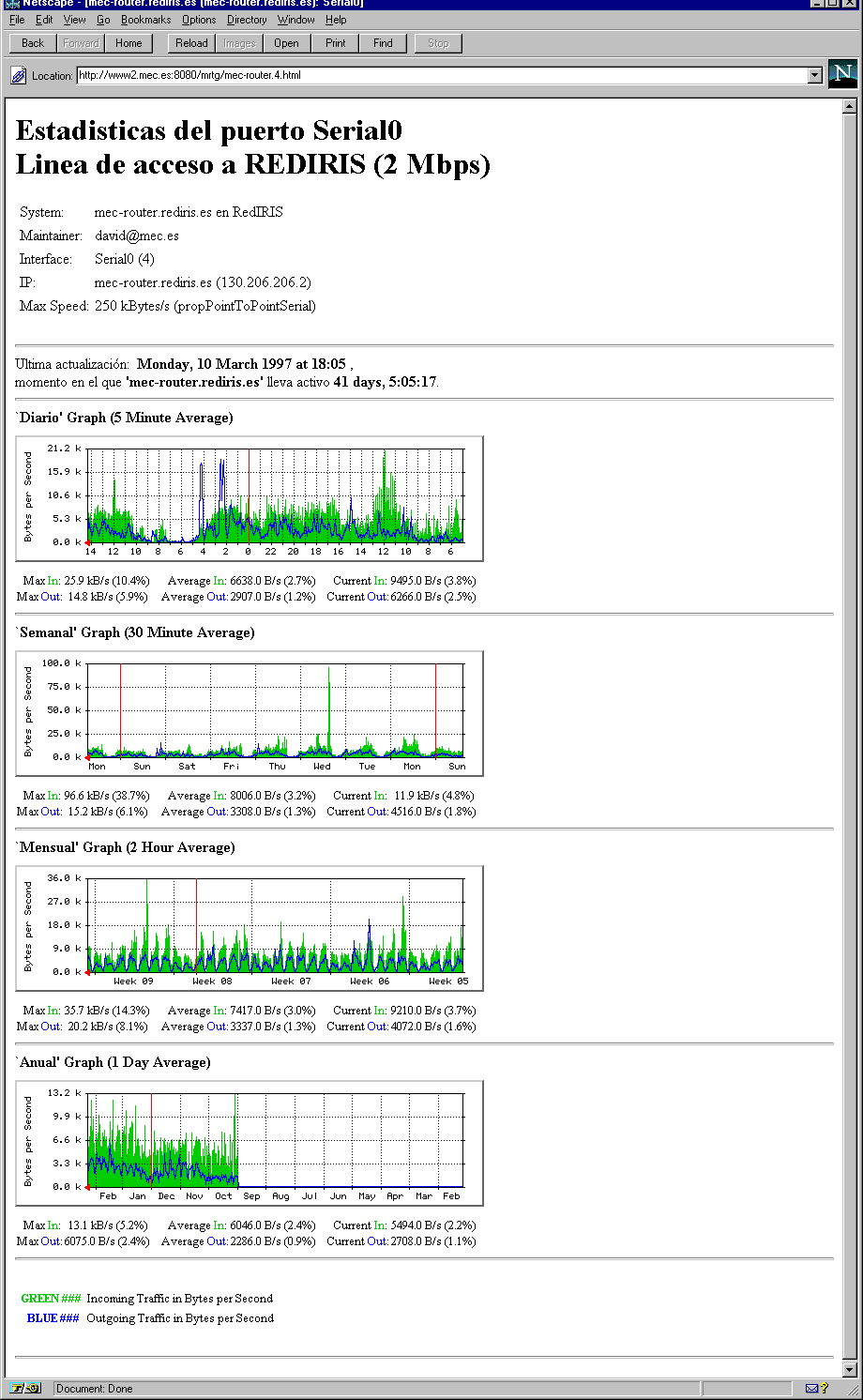 Another interesting feature of MRTG is the amount of information it generates. It permits four levels of detail for each interface: traffic in the last 24 hours, the last week, the last month and a yearly graphic. This allows you to gather information for statistical purposes. It maintains an accumulated database with all this information with the help of a consolidation algorithm that prevents the data in the logs from eating up your disk space.