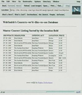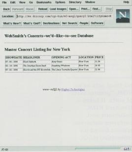 create table notices ( show_date char(10), headliner char(30), opening_act char(30), location char(30), ticket_price char(10) )To create the sample database and load it with initial data, execute the mkconcerts script located in the examples archive. For those of you who don't have ftp access, the data are shown in Listing 1.
