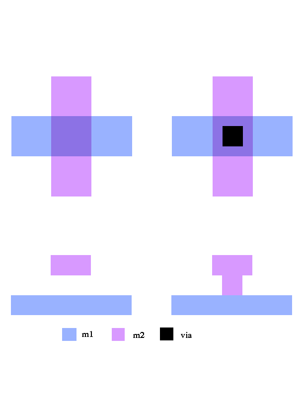 Each step in the fabrication process uses a different mask. Suppose we have a chip with two layers of metal wiring. We'll call the layer closest to the silicon base ``m1'' and the layer closest to the top ``m2''. Because m1 and m2 are different layers, m2 wires can cross over m1 wires without making electrical contact. This is like a high road using an overpass to cross a low road. The left side of Figure 1 illustrates, in both an aerial and cross-sectional view, a vertical m2 wire overlapping a horizontal m1 wire. Note that the two are electrically separate. Suppose now that we want to create a point where a signal can cross from m1 to m2. To build this structure, we need a mask for m1, a mask for m2, and a mask for vias. A via is a hole in the insulating layer, which separates m1 from m2 and allows m2 to flow downward and contact m1, forming an electrical connection. This is shown on the right side of Figure 1; the black square is the via, which connects the two layers. Transistors are more complicated, requiring more masks and different materials.