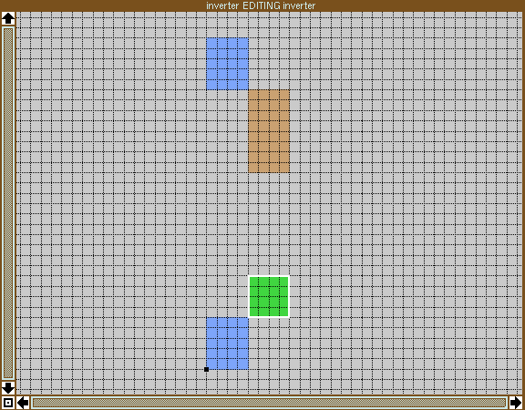 magic inverterA new layout window appears in which you design your chip; error messages and feedback appear in the window in which you started Magic (the command window). Magic handles window focus a little differently than you might expect--even though the input focus remains on the layout window, anything you type appears in the command window. Many commands work regardless of which window has the focus. When everything is ready, Magic displays a prompt in the command window.