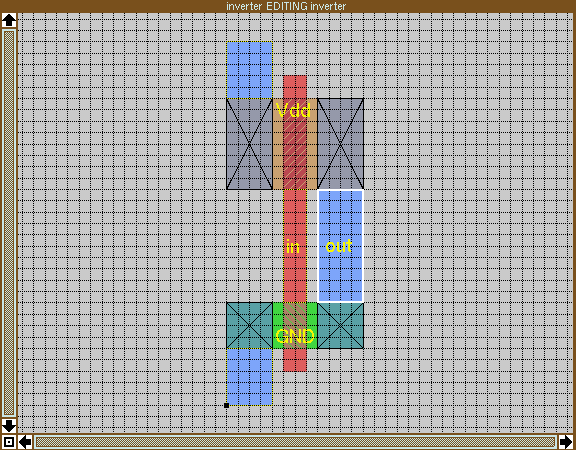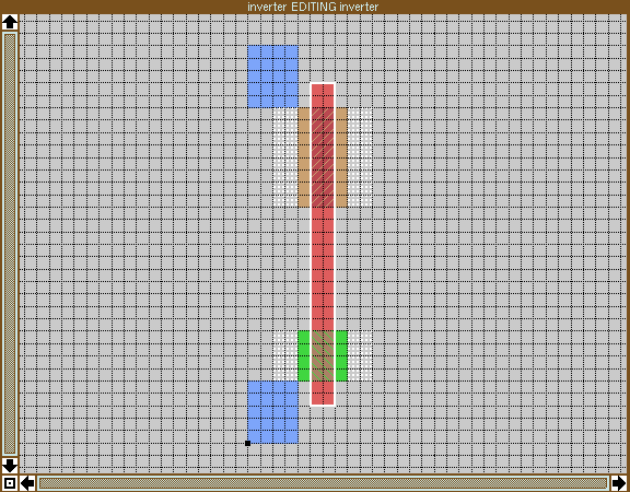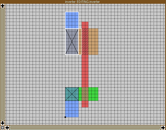 The transistors need poly running over the diffusion. In an inverter, the two polys for the transistors are connected together. This is the inverter's input--the signal driving the inverter is connected to the poly. It's simplest, then, to draw a single piece of poly which crosses both diffusions. Place the box at ll=(5,3) and ur=(7,29) and type: