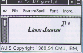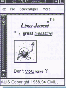 At an initial glance, the document you see displayed by ez appears to be What You See Is What You Get (WYSIWYG). Upon further investigation, however, you'll see that it really is not. While the document appears with various fonts and pictures as you might see on paper, the application does not enforce any concept of a "page". If you make the screen extra wide or narrow, the text will re-flow to fit the window, not some notation of a page. Documents are printed in PostScript™ (well, not precisely, but that is what comes out in the end), and of course the X fonts do not quite match those used when printing. So ez might better be said to be a WYSIWYG-almost editor. One pundit calls this "WYSLRN" (What You See Looks Really Neat).