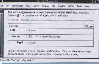 A page header or footer can be specified for your document by inserting the Header/Footer inset on the Media menu card. As shown in Figure 3, you can specify various fields. There are special $-keywords you can use for variable data. Select the AUIS Help menu and then select Show Help On... When prompted, enter headers to get more detail on headers. Alternatively, you may enter auishelp headers in an xterm window.