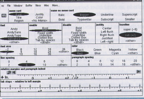 This format is the "magic" that allows ez to be so simple. The data quite literally defines what can be done to it. As the data is read, programs that match the data are automatically loaded for you. ez is not a single program, but a group of programs that can cooperate with each other, each of which knows how to manipulate a certain type of object. If ez reads a document with text in it, the text-editing program edits the text object. If ez reads a document with a bitmap (picture), the bitmap-editing program edits the bitmap object. If your document has several different objects, all the different programs cooperate to edit the objects.