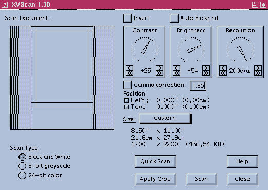 Scanning is fast and the quality is high; XVScan can quickly and easily handle scanning all the way up to 600 dpi. You can precisely select the dpi to use for scanning and you can adjust the brightness, the contrast, the gamma correction--most anything you'd like to control.