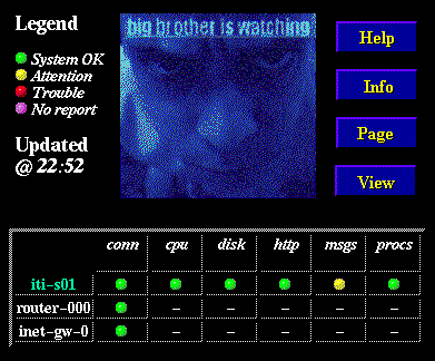 Legend [BIG BROTHER IMAGE] [help] [grn] System OK [BIG BROTHER IMAGE] [info] [yel] Attention [BIG BROTHER IMAGE] [page] [red] Trouble [BIG BROTHER IMAGE] [view] [blu] No report [BIG BROTHER IMAGE] Updated @ 22:52 [BIG BROTHER IMAGE] conn cpu disk http msgs procs iti-s01 [grn] [grn] [grn] [grn] [yel] [grn] route-r-000 [grn] - - - - - inet-gw-0 [grn] - - - - -As you can see, Big Brother is watching. While enduring the scrutiny of the Orwellian face peering out at me, I examined the rest of the display. It is colored like a traffic signal (green/yellow/red), and the update time is clearly displayed beneath it. To the right of ``Big Brother'' are four buttons, marked clearly Help, Info, Page and View. Beneath the header area is a table with six column headings and three rows, each neatly labelled with a computer host name. The boxes formed by the intersection of the rows and columns contain attractive green and yellow balls. The overall effect is like a decorated tree. The left side of the screen has a yellow tint, gradually becoming black at the center.
