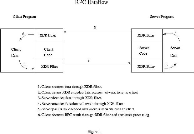 The flow of data from caller to callee and back again is illustrated in Figure 1. The calling program executes as a client process and the RPC runs on a remote server. All data movement between the client and the network and between the server and the network pass through XDR filter routines. In principle, any type of network transport can be used, but our discussion of implementation specifics centers on ONC RPC which typically uses either Transmission Control Protocol routed by Internet Protocol (the familiar TCP/IP) or User Datagram Protocol also routed by Internet Protocol (the possibly not so familiar UDP/IP). Similarly, any type of data representation could be used, but our discussion focuses on XDR since it is the method used by ONC RPC.
