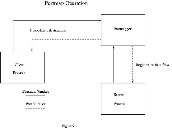 Now we have the necessary theory to complete our picture of the RPC binding process. An RPC application is formally packaged into a program with one or more procedure calls. In a manner similar to the port assignments described above, the RPC program is assigned an integer identifier known to the programs which will call its procedures. Each procedure is also assigned a number that is also known by its caller. ONC RPC uses a program called portmap to allocate port numbers for RPC programs. It's operation is illustrated in Figure 2. When an RPC program is started, it registers itself with the portmap process running on the same host. The portmap process then assigns the TCP and/or UDP port numbers to be used by that application.
