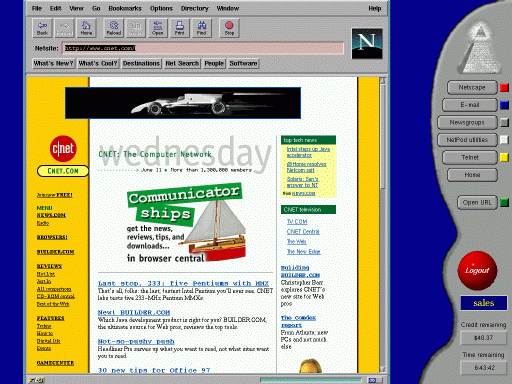 After login, the user is presented with a large Netscape window and a tool bar on the right hand side of the screen that lets them switch between the various parts of the system (see Figure 3). Their remaining time is also displayed on the tool bar. When an account holder logs out, their remaining money is kept for their next login session. When a guest logs out, any remaining money is lost.