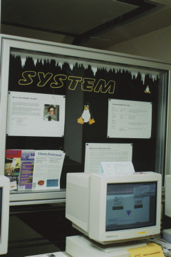 Behind the machines (see photographs) were the panels with posters about Linux (all in German): ``What is Linux?'', ``Information sources for Linux'', ``The GNU General Public License (GPL)'', ``Linux Development History'', ``Linux Time Line'' and ``Who is Linus Torvalds''. We also made information provided by SSC and Red Hat available beside the machines.
