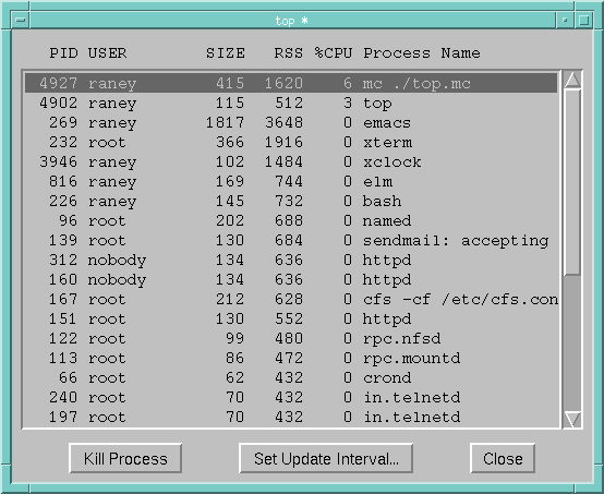A top program is a very useful thing to have on a multi-tasking operating system like Linux. You can use it to keep track of the CPU and memory usage of all programs running on the system and to detect and kill runaway processes. The character-based top program that comes with Linux systems can be improved. Because it isn't aware of the windowing system, it doesn't go to sleep when the window it is running in is iconified. It would also be nice if you could select a process to kill by clicking on it instead of having top type in its process ID.
