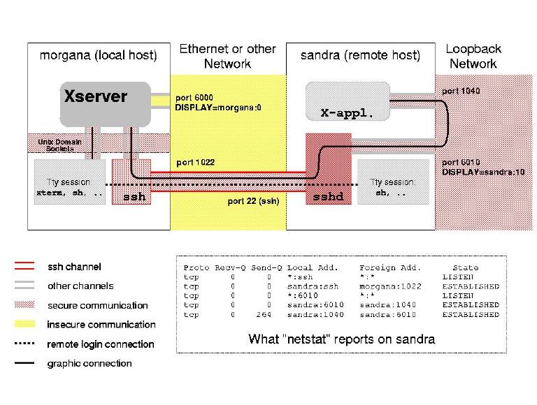 Figure 1 shows how a remote X application (running on a computer named sandra) securely connects to the local X server (on morgana).