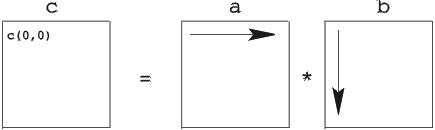 Rather than declaring the problem solved, let's think about the memory access pattern for a minute. Each element in the result, matrix c, is a dot product of a row in a and a column in b. For example, the element c[0][0] is computed as the dot product of the first row in a and the first column in b. This is illustrated in Figure 1. In our naive matrix-multiply routine, this means that the accesses to a form a nice, dense, linear memory-access pattern. Unfortunately, things do not look quite as good for b. There the memory access pattern is sparse: first, the element at offset 0 is read, then the one at offset dim and so on. Such sparse access patterns are bad for many reasons. Suffice to say it's easiest to optimize a machine for dense, linear accesses, so it is likely that those accesses will always be the fastest ones. Fortunately, there is a simple trick that avoids the bad access pattern for matrix b: before doing the actual matrix multiply, we can simply transpose matrix b. Then, all memory accesses are dense. Of course, transposing b causes extra work, but since that matrix is accessed dim times, this may well be worth the trouble.