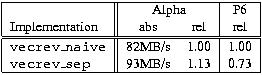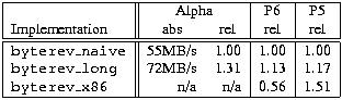 Now let's see how the implementations compare. Table 1 gives the results for the Alpha, the Pentium Pro (P6) and a 120MHz Pentium Notebook (P5). In addition to the two implementations shown above, the table also includes a row that shows the performance of the naive implementation when coded in x86 assembly code (implementation byterev_x86). This routine comes straight from the XFree86 v3.2 distribution.