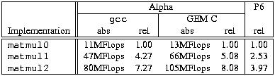 Here, the matrix pointed to by a gets multiplied by the matrix pointed to by b and the result is stored in c. The matrix dimension is passed in argument dim. On the Alpha, a 512 by 512 matrix multiply with this routine executes at about thirteen million floating-point operations per second (MFLOPS). This is not too shabby, but let's see whether we can squeeze more out of the machine. Having learned our lesson in performance optimization, we might try to unroll the inner loop and avoid all multiplications due to indexing. This does indeed result in a faster version: now, matrix multiply executes at about 15 MFLOPS.