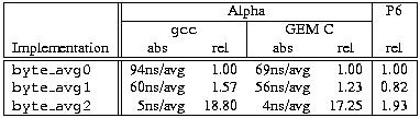 Note that GEM C generates much better code for the stupid version (byte_avg0) but just slightly better code for the clever version (byte_avg2). This is a common theme, at least for integer code: for well-structured code, gcc usually generates code that is on par with the GEM C compiler. The other interesting result is that the read ahead and loop-unrolling hurt on the P6. This means that byte_avg2 probably could be optimized more for the P6 (since it uses read ahead and loop-unrolling, too), but even so the P6 is twice as fast with the data-parallel version. This is impressive since the relative overheads are much higher for a 32-bit chip (the Alpha can amortize all the masking and shifting over eight bytes, whereas a 32-bit architecture has only four bytes).
