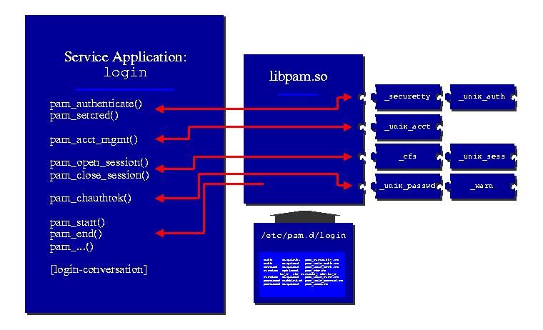 The application initializes the library with a call to pam_start(), which silently parses the configuration file and loads those authentication modules that are appropriate to this application. It then enters a loop that attempts to authenticate applicant users. This process is repeated until a user is correctly authenticated, or the loaded authentication modules indicate that their patience has been exhausted.