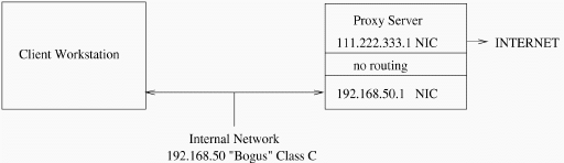 Configure your kernel to keep it from routing IP packets (see Listing 1). To further ensure protection and anonymity, use one of the ``bogus'' class addresses (see Table 1) as per RFC1918. These IP addresses are set aside by the INTERNIC for use behind a firewall. Any packet with one of these IP addresses is dropped by the Internet backbone routers. See Figure 1 for an example of a network topology with a dual-homed host firewall. The example configuration files in this article are based on this basic topology. Our protected network is assigned the ``bogus'' Class C address 192.168.50, and we assume that the valid IP address of the Internet side of the firewall is 111.222.333.1.