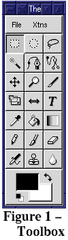 When you start the GIMP, you'll find it provides a single, small window with a set of buttons, called the Toolbox. The Toolbox is the starting point for creating images and is made up of a menu bar, the tool buttons and the foreground/background color block. If you are familiar with Adobe Photoshop then the look and feel of the Toolbox should be quite familiar to you. Figure 1 shows the default Toolbox configuration.