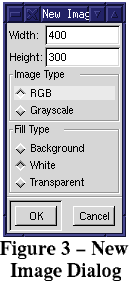 The New option opens a dialog that allows the user to select the dimensions of a new Image Window. The image type (RGB or grayscale) and the type of background to use are also selectable. Figure 3 shows the New Image dialog box. As with many options in the GIMP, you can also open a new window using keyboard accelerators. For a new Image Window, place the cursor over any GIMP window and type ctrl-N.