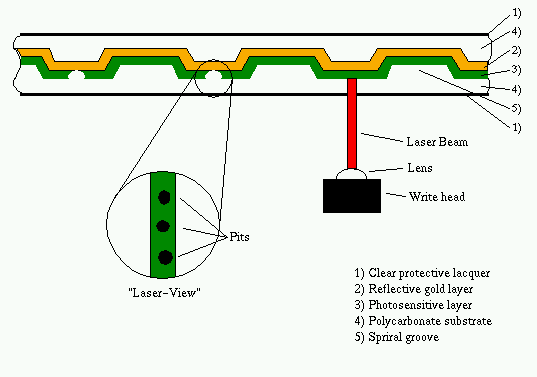 On the writable CD, the polycarbonate substrate, has a spiral groove that helps the laser stay on course during burning and playback. On that substrate a thin gold layer is laminated to provide the best possible reflection to a reading laser. Over the gold layer is a photosensitive dye layer, and over that is a clear protective lacquer. While you use a weak laser to read a CD, you need more power to write. The laser beam heats the photosensitive layer and creates a kind of hole that shows us the gold layer. When you read such a CD-Recordable, the holes in the photosensitive layer can be interpreted as ``pits'', making it possible to read such a CD with all common CD-ROM and audio players. However, the ``pits'' are not as sharp as on a pressed CD and can cause troubles on a few older CD-ROM drives, which report occasional read errors, while others perform flawlessly.