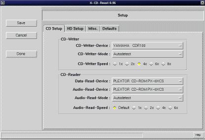 In this menu you specify all the hardware X-CD-Roast needs, including your CD writer, the hard disk partition that will store any CD images, your sound device and so on.