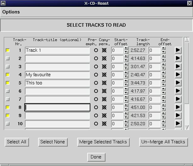 When you wish to copy an audio CD (a music CD) or a mixed-mode CD (a CD that contains one data track and some music tracks), you must copy each track to a single file. X-CD-Roast is equipped with a built-in player so you can listen to each track via a sound card. You can read audio tracks in any sequence and from as many CDs as you wish, as long you keep in mind that only about 74 minutes (or 63 minutes) fit on one CD-Recordable.