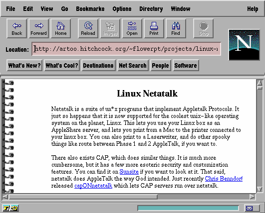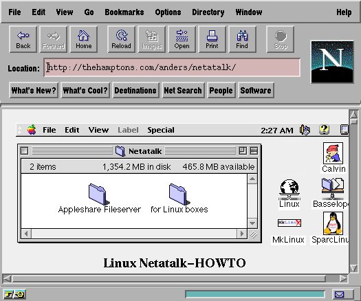You can transfer small files with a floppy disk (a.k.a. SneakerNet). When the file size exceeds the 1.44MB floppy limit, however, the solution is FTP--fast and efficient, but cumbersome when moving multiple directories containing subdirectories. The ideal solution is to mount the Linux file system on the Mac desktop, then drag and drop files and directories as you do under the normal MacOS. This is exactly the solution that Netatalk gives you. You can also use Netatalk to send print jobs to the Linux printer from the Mac, thereby sharing other system resources.