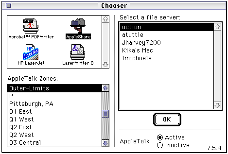 Now for the fun part--go to the Macintosh Chooser and select AppleShare as shown in Figure 4. The Linux system host name will appear on the desktop just like any other Appletalk-compatible machine on the network. There is an 8-character password limit on the Mac, so if your Linux password is more than 8 characters, change it.