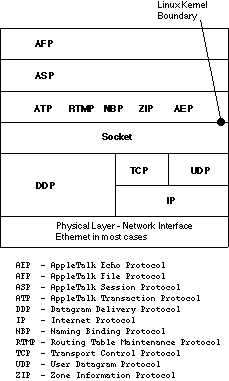 Note that prior to the release of Linux 2.x, installation of Netatalk required that the Datagram Delivery Protocol (DDP) software be integrated into the kernel. Now that DDP is part of the Linux kernel, all you need to do is make sure that you turn on Appletalk during kernel configuration. Do this by specifying the kernel configuration option as: