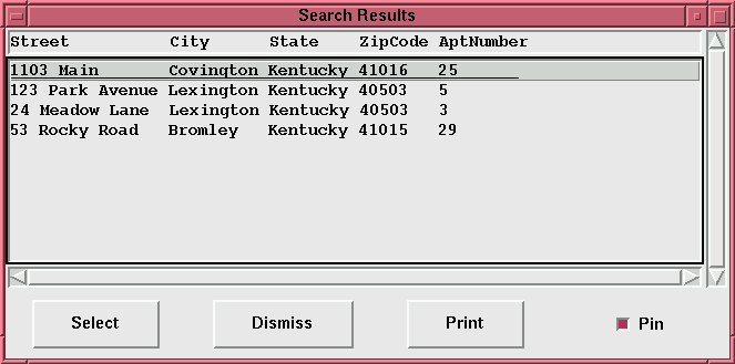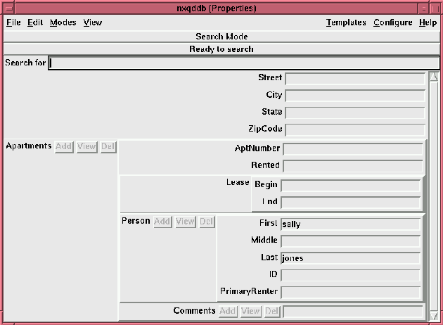 Once you have added some records, you can go to Search Mode and perform simple, fast database queries. For example, let's say you want to find all the people renting apartments whose first name is Sally. Just type ``sally'' in the Apartments.Person.First entry box and press return. If you want to confine your search further, to the last name ``Jones'', type ``jones'' in the Apartments.Person.Last field and press return. A list of all the properties matching the criteria will appear in a Search Results window as shown in Figure 2. If you want to edit one of the records, click the mouse on the entry and you will be switched to Change Mode for that record.