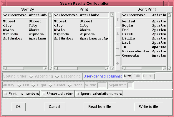 If you click the Configure menu button, you will notice many configuration options. This is the current state of all your nxqddb settings. The search results configuration (see Figure 3) determines what fields are present in the search results, how those fields are displayed, and in what order. You can also add user-defined columns to the search results.
