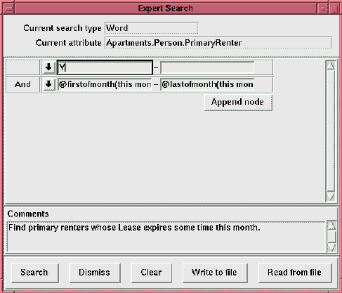 Suppose you want to find all the primary renters whose lease expires this month. The idea is to provide a list of the search criteria to the expert search engine. Our search then should be all Apartments.Person.PrimaryRenter == ``Y'' and Apartments.Lease.End == ``@firstofmonth(this month)-@lastofmonth(this month)''.