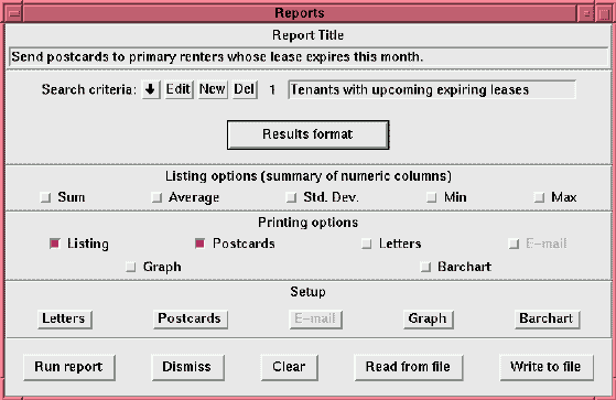 We have already seen how to perform the expert search, so let's just use the previous example for defining what you want to see in your report. Next, we have to define the relevant fields for the report via the Results Format button. To generate a postcard, we must include all address information, plus we probably want to include the lease's expiration date for inclusion in the message. Now, we can choose the type of reports we wish to generate. If you want a listing as well as postcards, you can choose both options and click the Run Report button. Since we chose listing as well as postcards, the listing appears first and can be printed out. After printing the listing, we are prompted for the postcard message as shown in Figure 6. Notice that the postcard message is personalized for the recipient by using data from each record.