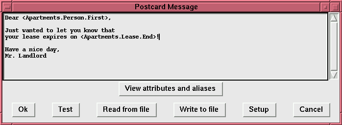 For example, suppose we want to send a postcard to each renter whose lease expires this month. First, we need to configure the format of our return and destination addresses. Choose the Report Format Defaults option under the Configure menu button. You will notice two options in the cascaded menu: Return Address and Destination Address. Choose Return Address and fill in the return address as you want it to appear on postcards and letters. Next, choose Destination Address. This option will format arbitrary fields for the destination address on all postcards and letters. Once you have configured the addresses, you may wish to save your configuration so these options become the default.