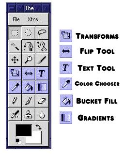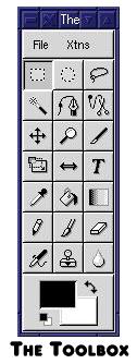 The Toolbox is made up of buttons set in a seven row by three column box, with a menu bar at the top and a foreground/background color selection box at the bottom. The menu bar holds a File menu similar to the one in the Image Window (although with fewer options) and an Extensions menu. The latter allows you access to the Script FU scripting interface. We'll get to that a little later. The tools are selected by a single left-button mouse click over the appropriate button. A double click opens the Tool Options dialog window that provides access to configurable options for the selected tool, if any are available.