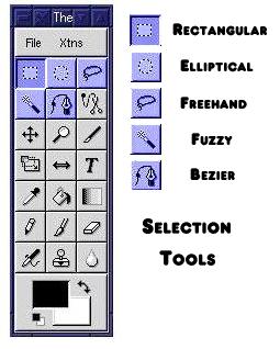 The Toolbox offers the five basic selection methods: Rectangular, Elliptical, Free Hand, Fuzzy and Bezier. For those of you who have used Adobe Photoshop, the Rectangular and Elliptical selections are accessed from Photoshop using a single tool called the Marquee. The Free Hand selection tool in the GIMP is referred to as the Lasso in Photoshop. All of these work basically the same, although the Tool Options dialogs in the GIMP look different than their counterparts in Photoshop.