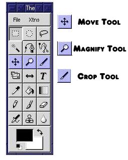 The third row of buttons holds the Move, Magnify and Crop tools. The Move Tool allows a selected region or regions to be moved. The Move tool is more sophisticated than it might seem at first. When used with the Layers and Channels dialog, it becomes possible to select various pieces of an image to adjust them within the framework of the complete image.