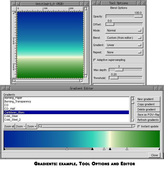The last tool in the fifth row of the Toolbox is the Blend Tool. This tool is used for filling a region in a direction the user specifies with a blended color pattern. The colors used can be blended from foreground to background, foreground to transparent or from a custom gradient provided by the Gradient Editor. The Gradient Editor can be opened from the Image Windows pop down menus as ``Dialogs->Gradient Editor''. There are a number of default gradients that come with the distribution as well as a number that have been created or collected by the Gradient Editors author, Federico Mena Quintero, known affectionately to the GIMP developers as Quartic. The resources section of this article lists Quartic's web pages which are considered the definitive resource for finding anything related to the GIMP, including more custom gradients.