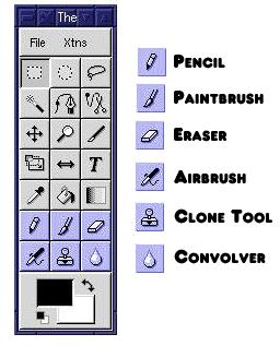 The next four buttons are the closest thing to drawing tools the GIMP provides. They are, in order: the Pencil Tool, the Paintbrush Tool, the Eraser Tool and the Airbrush Tool. Each of these requires that a brush type be set. (There is a default setting, but you'll find you'll wish to change this fairly often.) The Brush Selection dialog allows selection of the brush type. Once selected the brush type is applicable to each of the drawing tools. The Pencil Tool draws solid lines that follow the shape of the brush using hard edges. Using a brush like the Duck or Guitar results in an effect similar to using a stencil. The Paintbrush works similarly, although the edges of the stencil are much softer, having been antialiased.