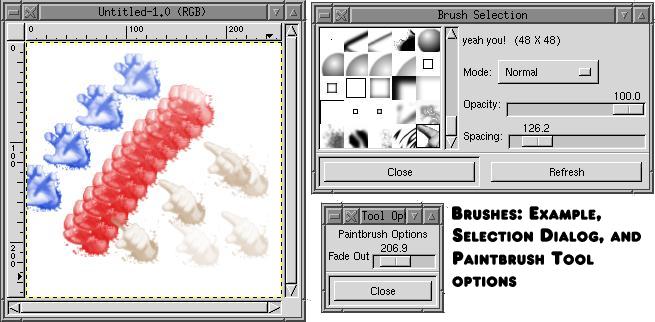 All of the drawing tools use the current foreground color, to do the drawing. If the brush type is not a solid pattern, the darker areas of the brush come out in the foreground color, and the lighter areas of the brush come out transparent (with the current pixels showing through the area the brush doesn't cover). This behavior can be modified using the Mode and Opacity settings on the Brush Selection dialog. The dialog also allows you to specify how fast the brush is applied using the Spacing setting. Lower spacing values cause the brush to be repeated quickly, overlapping the individual applications of the brush shape. Higher settings cause the brush to be applied less often as the mouse is moved around the Image Window.
