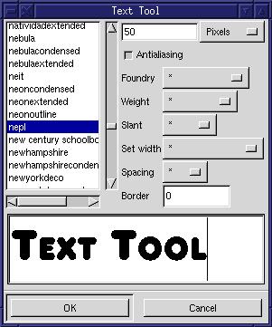The only other part of this dialog that you'll find yourself using regularly is the Size setting. The size value is a text field that you can type in to set the size of the font. Next to this is an options menu. This menu has two options: Pixels and Points. The difference isn't completely clear to me, so I use Pixels most of the time. I expect, when I become more educated as to the use of these settings, I'll find a need for the Points option. The Size value, however, is an item I use quite often. Note that when you type in a new size and press enter, the text field at the bottom of the dialog is adjusted to reflect the new size. Also note that the text in this field is not antialiased, even if the Antialiasing toggle button in the dialog is set (it's set when the toggle appears depressed). The antialiasing setting only affects the way the text is displayed in the image.