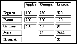 <CENTER> _Start_Table(BORDER=5) _Table_Hdr(,Apples, Oranges, Lemons) _Table_Row(England, 100,250,300) _Table_Row(France,200,500,100) _Table_Row(Germany,500,50,90) _Table_Row(Spain,,23,2444) _Table_Row(Danmark,,,20) _End_Table </CENTER>