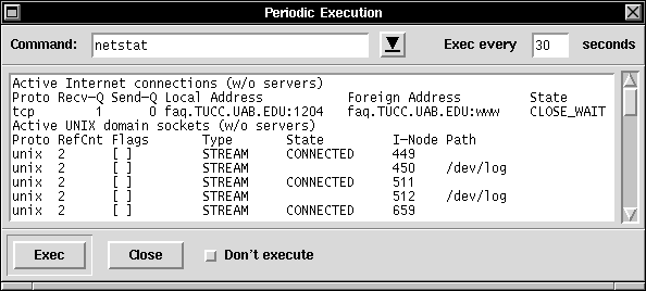 Last, curious if anyone is currently accessing the web server, I run the netstat command. However, I don't run it from the command line. I choose the ``netstat'' option I have set under the System Statistics icon, which opens the ``Periodic Execution'' tool, running the netstat command (see Figure 5). The Periodic Execution tool, in this case set to run netstat every 30 seconds, is one of several general purpose tools which TkDesk provides.