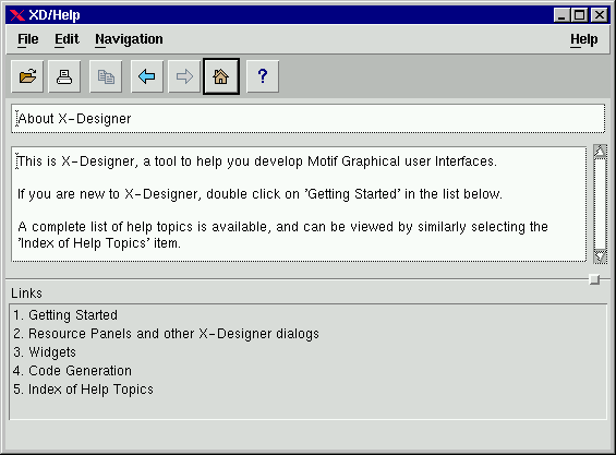 The user interface is appealing and is designed with programmers in mind, not the users who go ``aaaah'' at every flashy icon that pops up. Help was there, as it should be with any Motif application. By default, the provided XD/Help browser is launched at help request, but there is an option to use Netscape or any other browser for the same purpose. I prefer the provided XD/Help utility, since Netscape offers the same functionality but eats up system resources mercilessly compared to the small XD/Help and even X-Designer itself. Help is all in text mode, but I believe that after using X-Designer for some time, the need for the on-line help slowly vanishes. There is no Motif programming information provided, and the widgets are described only briefly. A Motif reference book should be handy while seriously using X-Designer. I believe the help system serves its purpose very well and is designed with the correct assumption that advanced users do not need a lot of colorful diagrams, examples and tips, but just a quick reminder of what is happening.