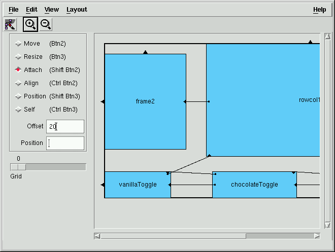 The application appearance is built simultaneously as the elements are added to the design tree. X-Designer doesn't simulate the appearance; it actually builds the widget tree from the real widgets. This makes it a sort of WYSIWYG GUI builder, which introduces a dangerous possibility. If the actual widgets created while building the application are connected or configured in a forbidden manner, X-Designer may crash because an unexpected widget condition will appear within the X-Designer executable. Being aware of this problem, I tried to create all kinds of weird designs, but X-Designer is very strict and positively sure it knows more about Motif than I do--it would not allow me to add invalid widget relations to my design.