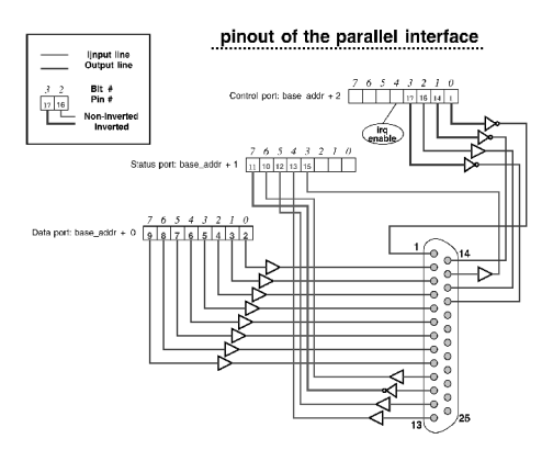 The parallel port is a simple device; its external connector exposes 12 output bits and 5 input bits. Software has direct access to the bits by means of three 8-bit ports: two ports for writing and one for reading. Moreover, one of the input signals can trigger an interrupt; this ability is enabled by setting a bit in one of the output ports. Figure 1 shows how the three ports are mapped to the 25-pin connector. The base_addr of a parallel port (the address of its data port) is usually 0x378, 0x278 or 0x3bc. The vast majority of the parallel ports uses 0x378.