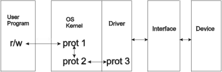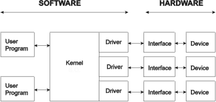 Figure 1 shows the relation between user programs, the OS and the devices. Differences between software and hardware are clearly specified in this scheme. At the left side, user programs may interact with the devices (for example, a hard disk) through a set of high-level library functions. For example, we can open and write to a file of the hard disk calling the C library functions fopen, fprintf and close: